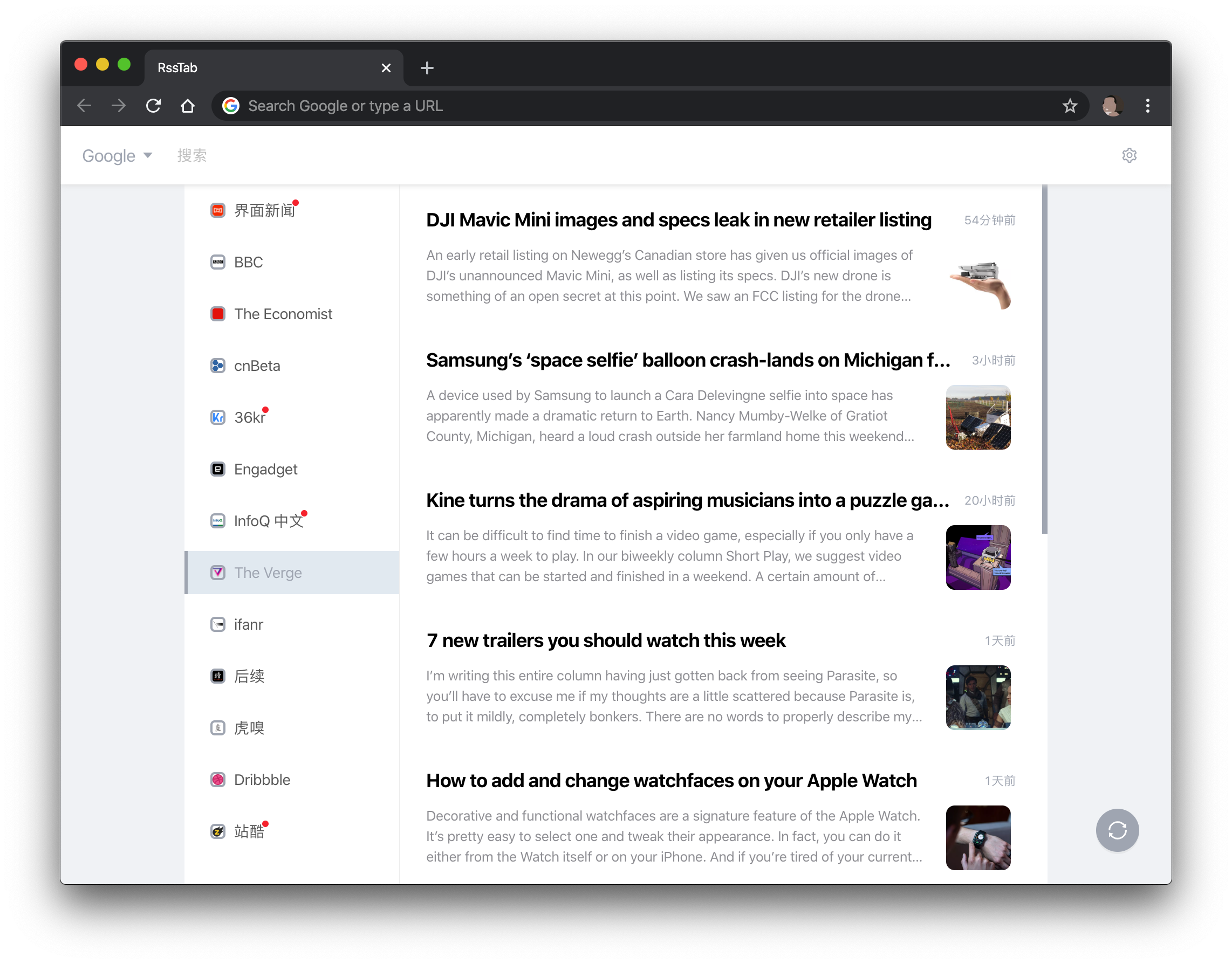 RssTab 介绍 一个可以附着在新标签页的 RSS 阅读器,由 RSSHub 提供 RSS 支持。 安装说明 安装商店扩展版本 Chrome Web Store 安装开发版本 yarn yarn build 或者 npm install npm run build 然后打开 chrome://extensions/ 并开启开发者模式,将 build 文件夹拖入至窗口中即可。 Roadmap 支持表单化的 RSS 地址构造。 插件角标提醒获得更新的订阅数量。 丰富表单化的 RSS 地址构造种类。