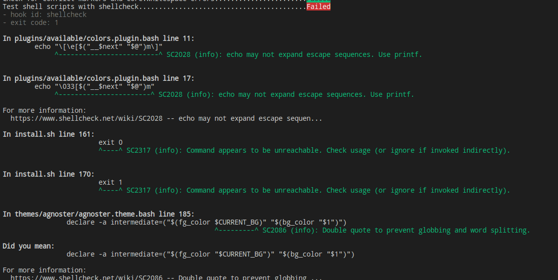 * fix (plugins): enable interpretation of backslash escapes in colors * fix (lint): disable SC2317 in install.sh * fix (lint): SC2086 in agnoster theme * fix (lint): remove exit from install.sh as it is already implemented in the calling function