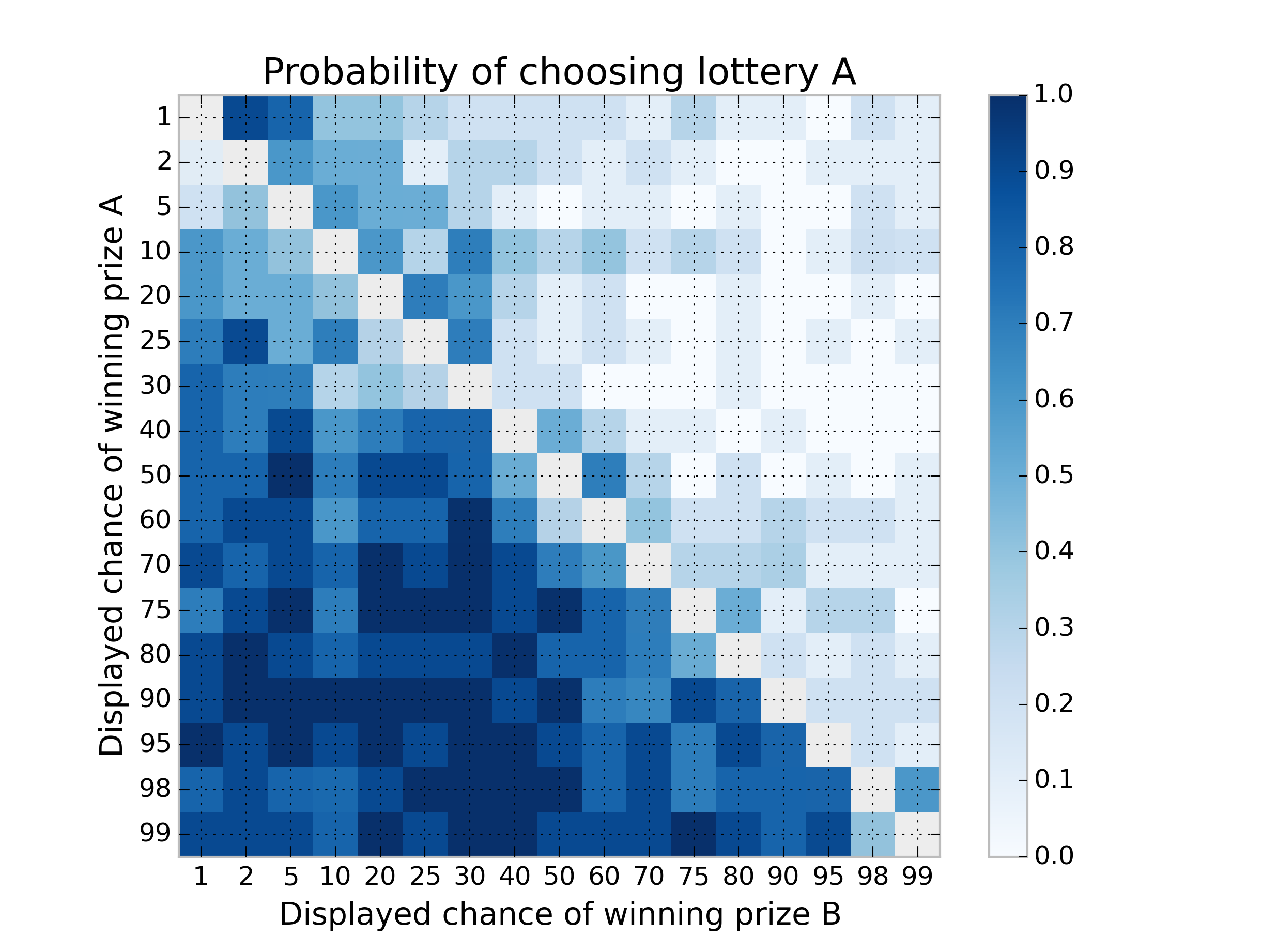- As expected, people are loss averse: every point in the lower-diagonal is where lottery A had a high probability of success than B. The matrix shows that most points in here are greater than 50%, thus people chose the safer bet more often.
