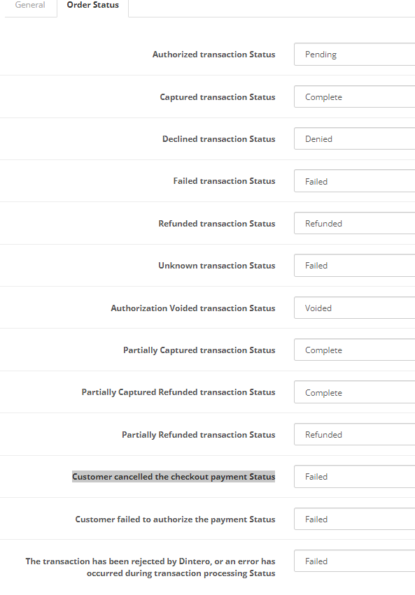 After you filled out the checkout page and enter the Dintero payment module, where you can choose the payment method (card, vipps, wally). you can cancel payment if you press on cancel. The issue is, If you press an cancel there in payment window, an new order with order status "pending" will be created in store, and you get an email for order confirmation that you have placed an order with order status pending. It is logical that no order should be created, if user cancel payment. If the concept is that an order has to be created in OpenCart anyway regardless of whether you cancel or Fail payment, the order status of new created order in OpenCart must be on Failed and not pending. In admin panel the plugin is set up for Customer cancelled the checkout payment Status: Failed