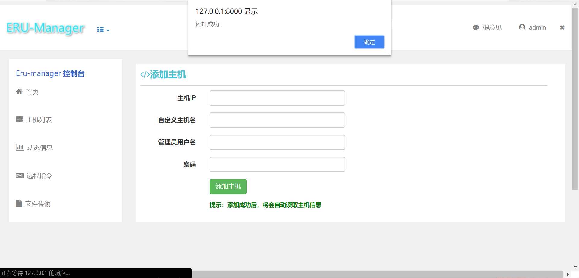 按钮, 跳转至添加页面, 将要添加的主机IP, 可以把管理员信息填进去, 系统会自动去读取管理的主机相关信息, 并保存到数据库, 添加成功
