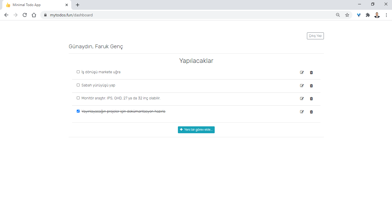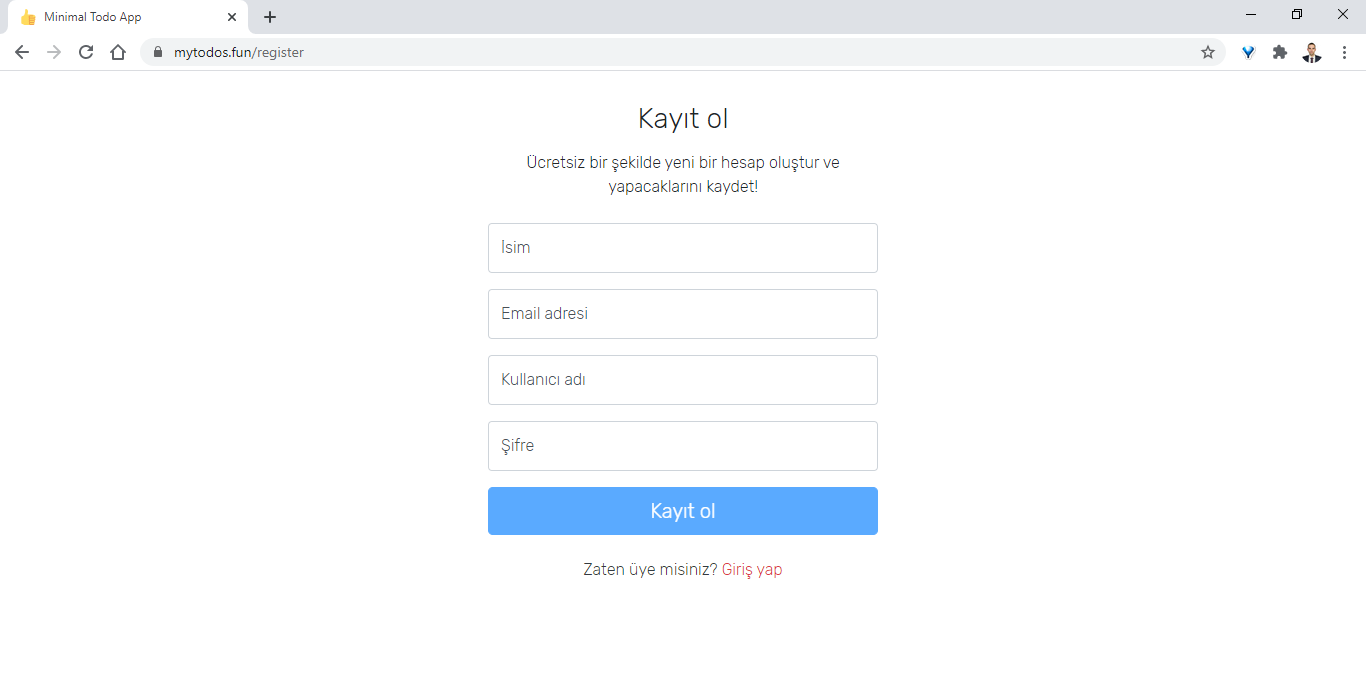 Minimalist Todo App yapılacak işlemlerinizi kolay bir şekilde yönetmek için geliştirilmiştir. Basitçe üye olabilir, yapılacak işlerinizi kaydedebilir daha sonra silebilir ya da tamamlandı olarak işaretleyebilirsiniz.