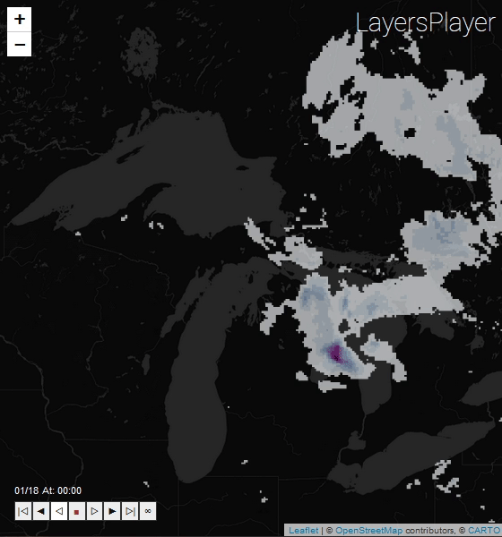 The following animation shows the usage of the built-in Layers Player controller to display an hypothetical precipitation event in the North American Great Lakes region.