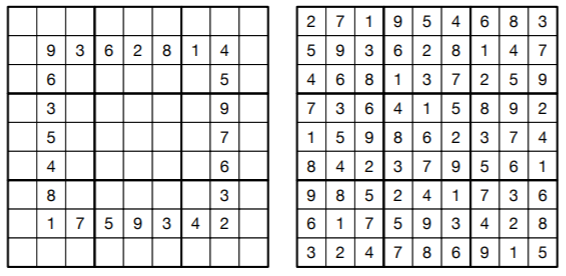 For those unaware of this game (e.g., people coming from Mars...), the puzzle consists of a partially filled matrix n × n. The algorithm needs to fill the blank positions with values 1 through n such that no number is repeated on each of the n rows, n columns, or the n squares of √n × √n cells that split the original matrix.