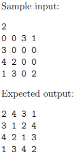 - n lines, each with n integers, separated by a space, with values in the interval [1, n].