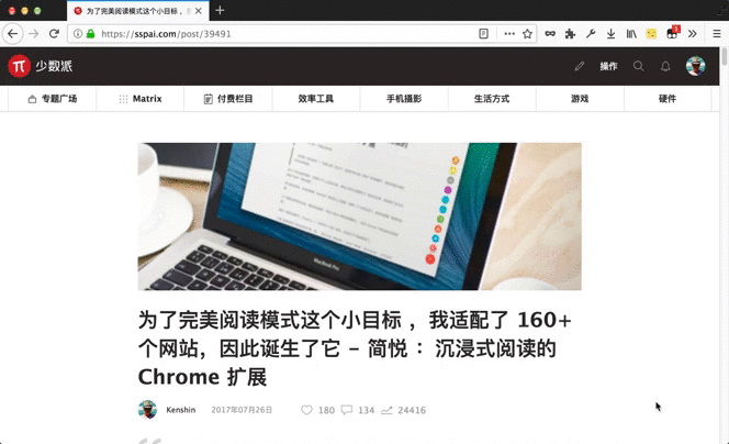 安装完毕后,打开 https://sspai.com/post/39491 键盘快捷键 → A A(双击 A) 就可以进入阅读模式;