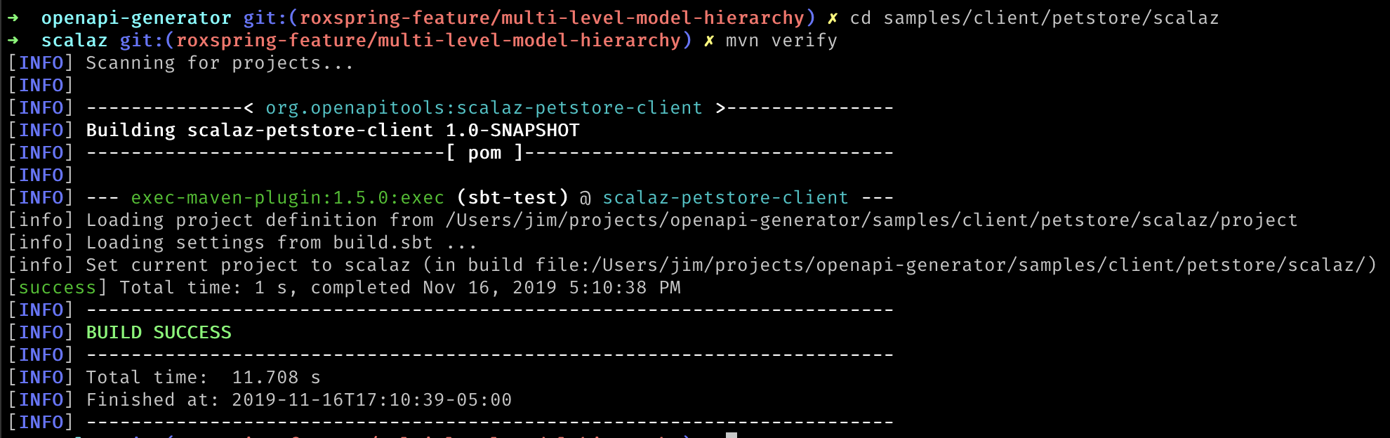 I'm unable to repro verification issues with scalaz (see below), but I'd recommend commenting it out of pom.xml (~ lines 1101, 1193) if it occurs again and we'll look into it further. Regarding your change, I'm confused a bit by this block: String parentName = getSimpleRef(schema.get$ref());