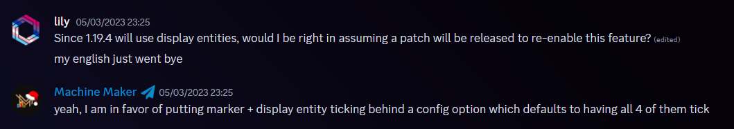 Just like the last person said, I've worked with many display entities and have created various APIs for using and creating complex models with them. The lag that comes from display entities has nothing to do with them ticking and everything to do with tracking them, the more you have the laggier any getEntity, getNearbyEntities, etc methods will be and there isn't really a solution to that unless we made it skip them or something. I'm all for trying to find ways to reduce their impact but ticking isn't the issue |