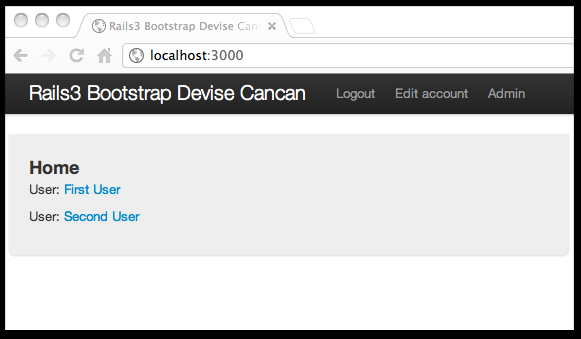 This application provides no useful functionality apart from demonstrating Devise with CanCan and Twitter Bootstrap working together on Rails 3. Add any models, controllers, and views that you need.