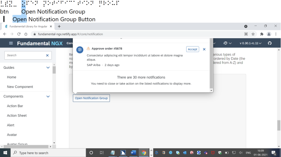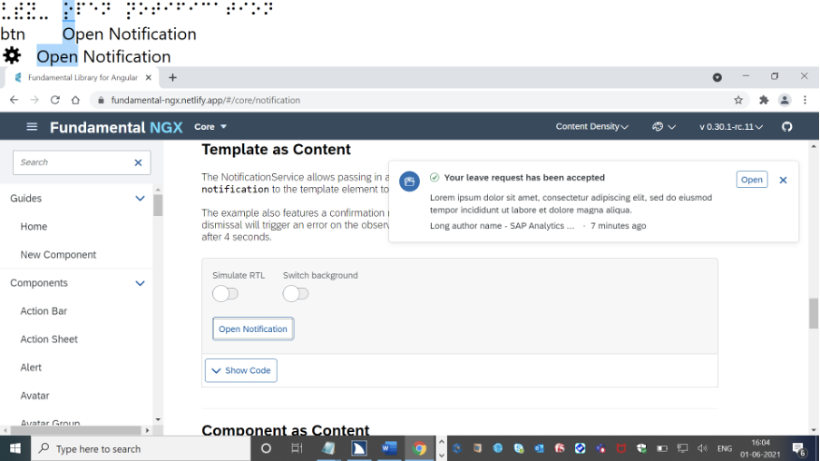 On activating the ‘Open Notification’ ad ‘Open Notification Group’ and ‘Open from Component’ button, the dialog appears and there is no keyboard support provided for the ‘Open’ and ‘Close’ button, Once the keyboard support is provided the information about the dialog should be read.