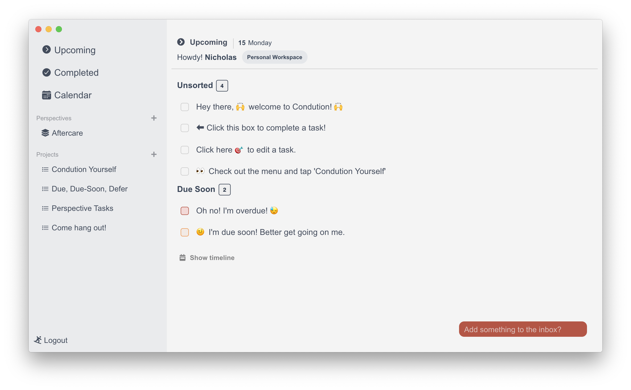 Create tasks, manage them in projects, add some tags, set due dates, and repeat them at will. Condution has the whole nine-yards of the core list-making features nailed so you can create and edit anything from grocery lists to hundred-task projects.
