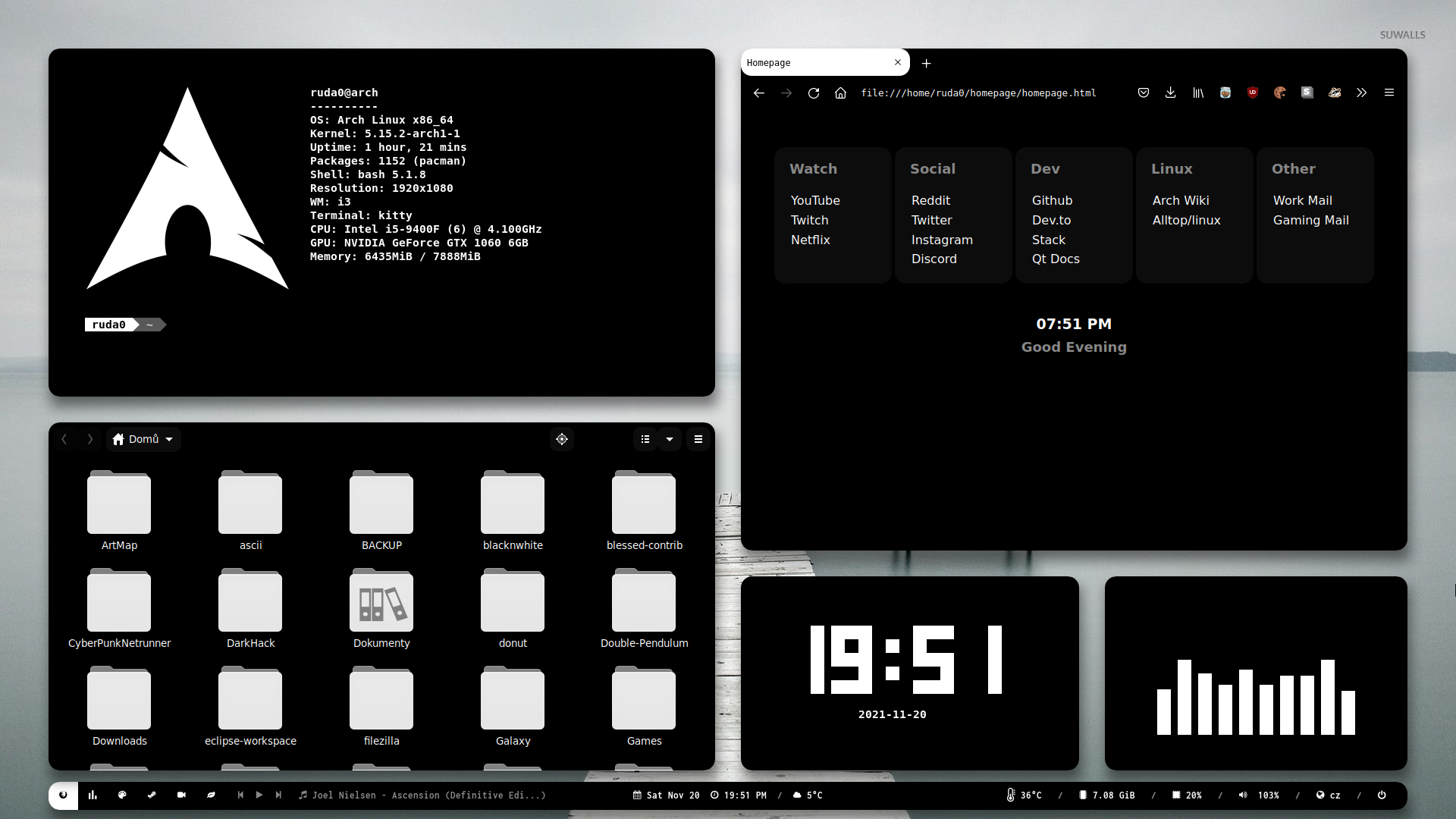 BetterDiscord, Spicetify, Xcursor, Nautilus, cava, rofi, Polybar, i3-gaps, i3-scrot, picom-git, neofetch, code-oss, gtk-3.0, eye of gnome, tty-clock, powerline, kitty