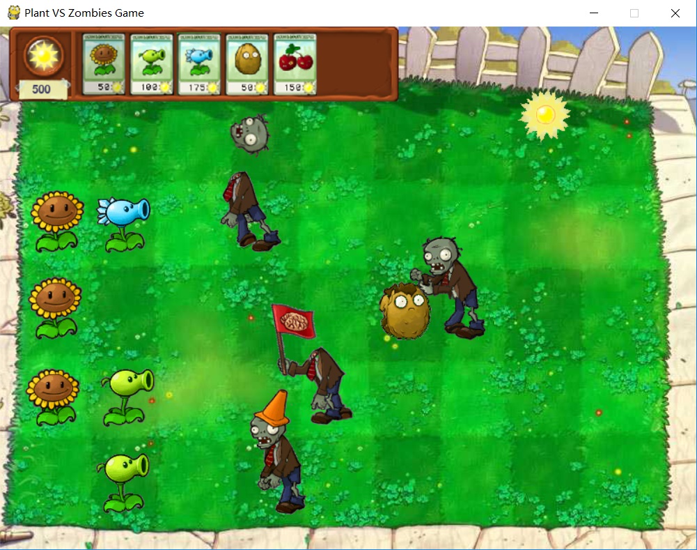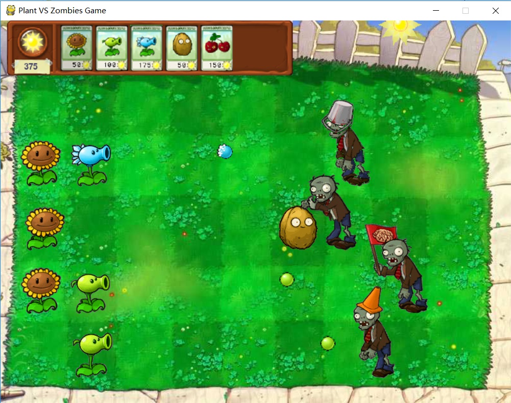 - implement plants: sunflower, peashooter, wallnut, snowpeashooter, cherrybomb, threepeashooter, chomper, puffshroom, potatomine, spikeweed, scaredyshroom, squash, scaredyshroom, jalapeno, sunShroom, iceShroom.