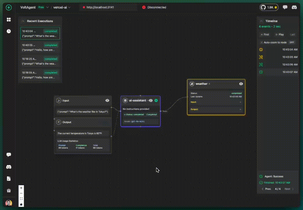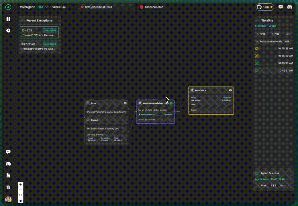 This example demonstrates how to add VoltAgent observability to your existing Vercel AI applications with minimal code changes. Track AI calls, tool usage, and multi-agent workflows in the VoltAgent Developer Console.
