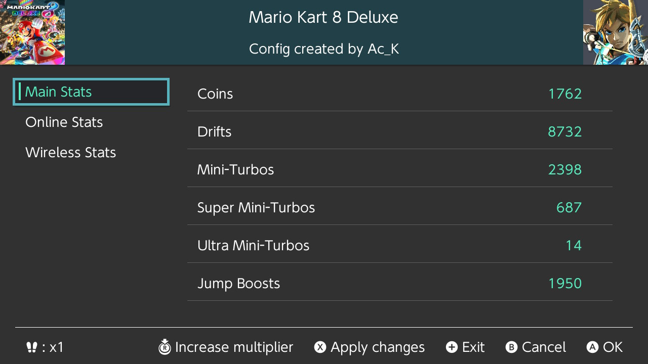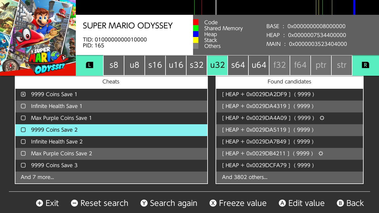 - Freezing of values in RAM via Atmosphère's cheat module.