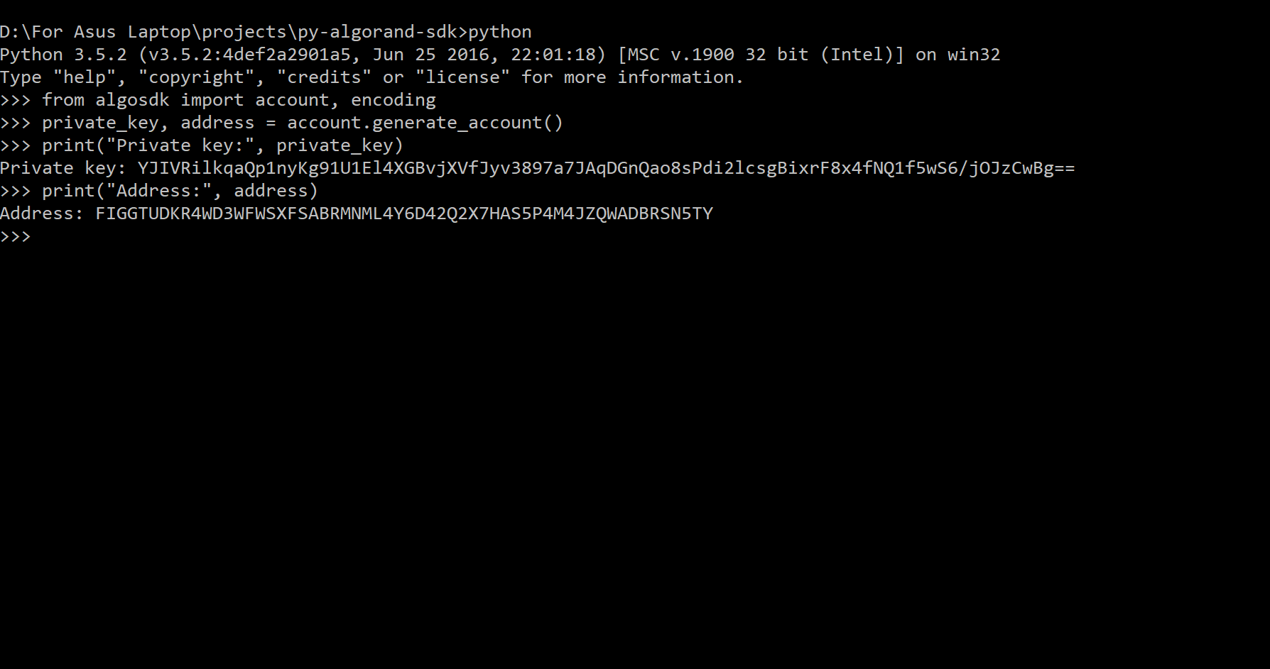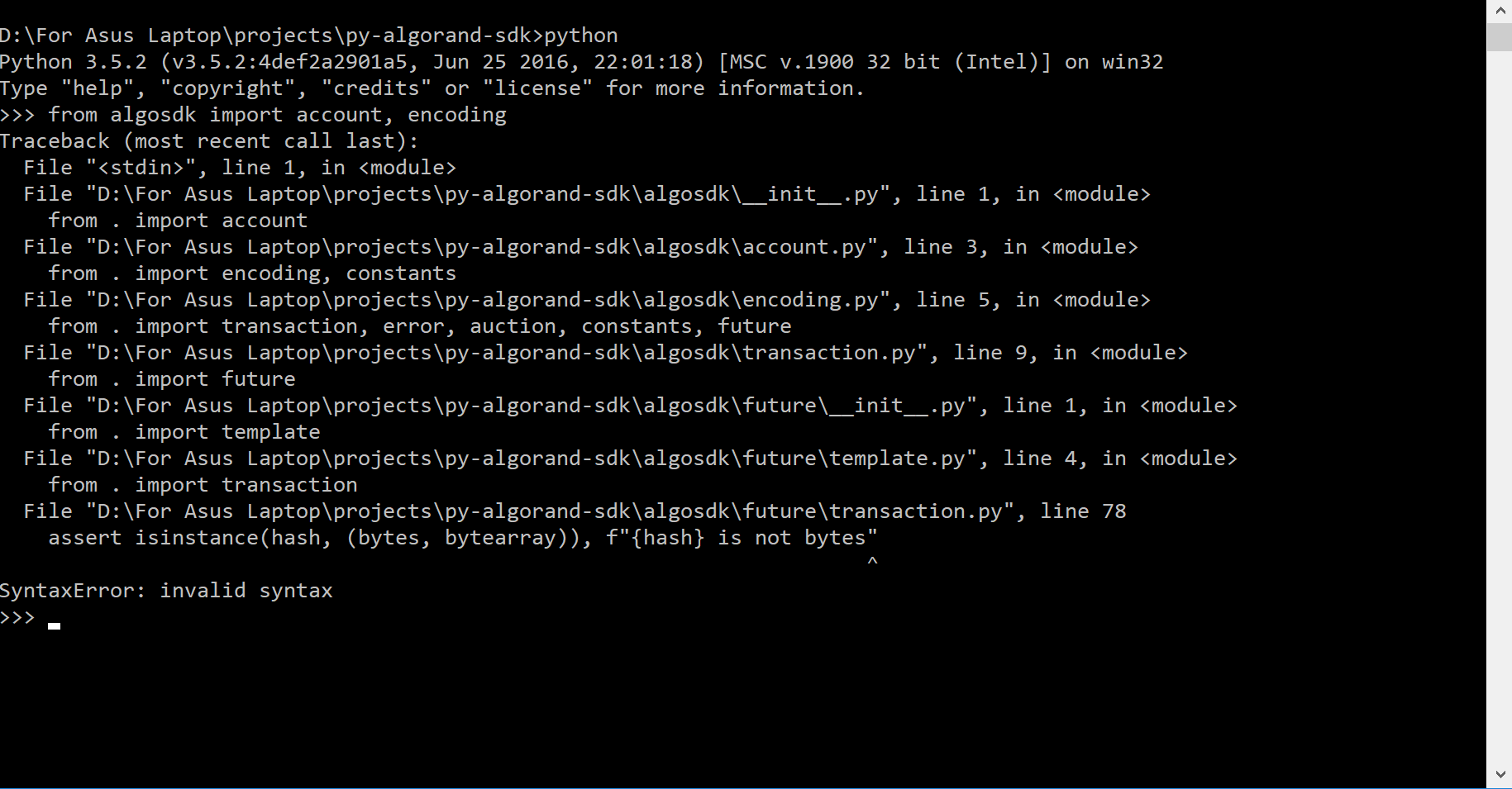 py-algorand-sdkdoesn't work on Python < 3.7.f-Strings was introduced in Python 3.7, so I changed it to a more general method (