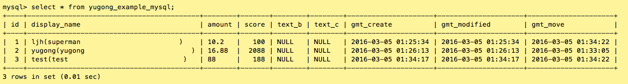 - 目标库多了一个字段. mysql中多了一个gmt_move字段,(简单的用迁移时的当前时间进行填充)