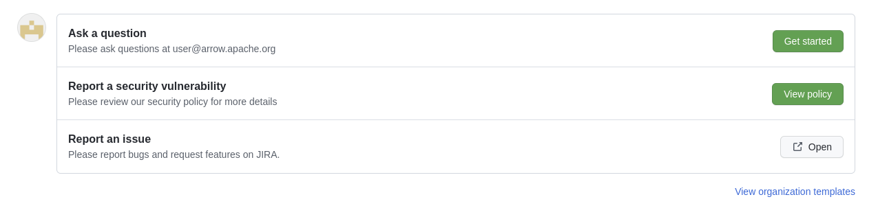 Users attempting to report issues via the Arrow GitHub project see the following options:  If issue tracking for the project is migrated to GitHub issues from ASF Jira, this will need to be adjusted [here](https://github.com/apache/arrow/tree/master/.github/ISSUE_TEMPLATE).