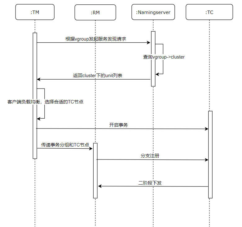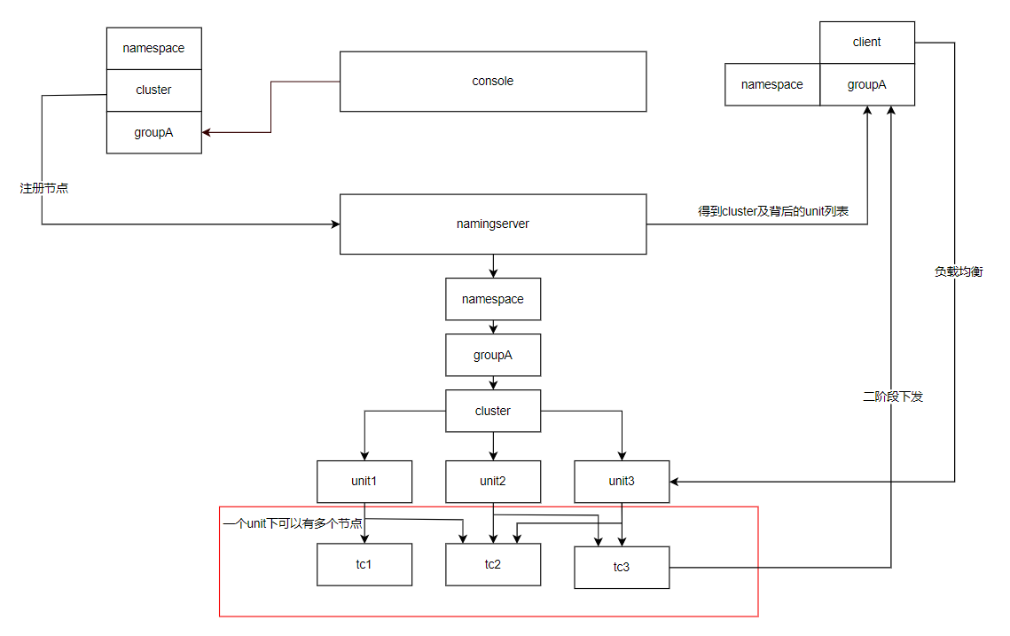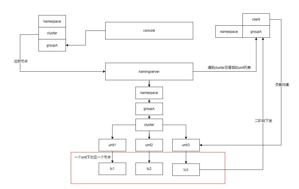 2.一个事务分组会被映射到一个cluster中,然后在该cluster下的unit列表中通过负载均衡策略选取一个unit,根据其元数据中指向的tc节点执行事务