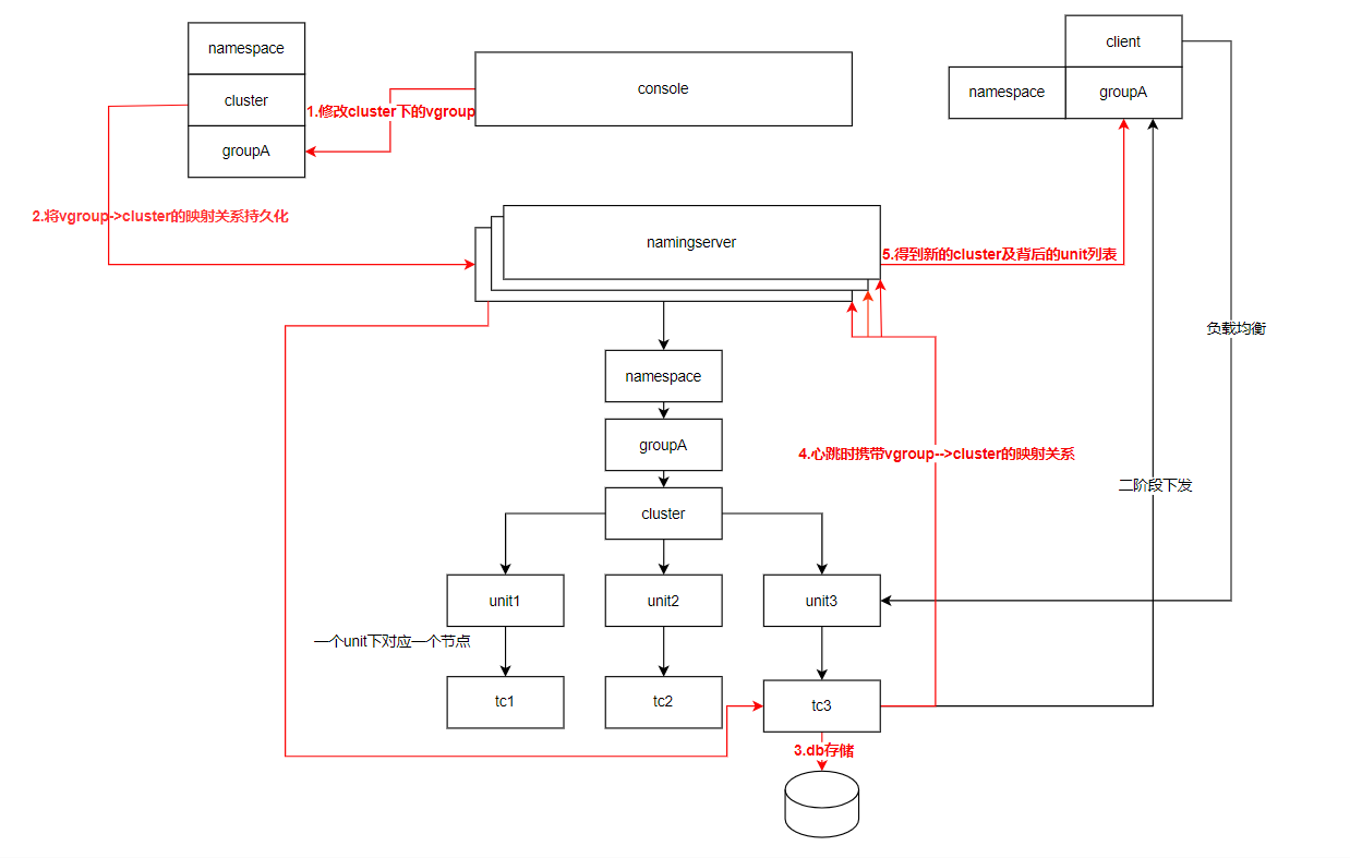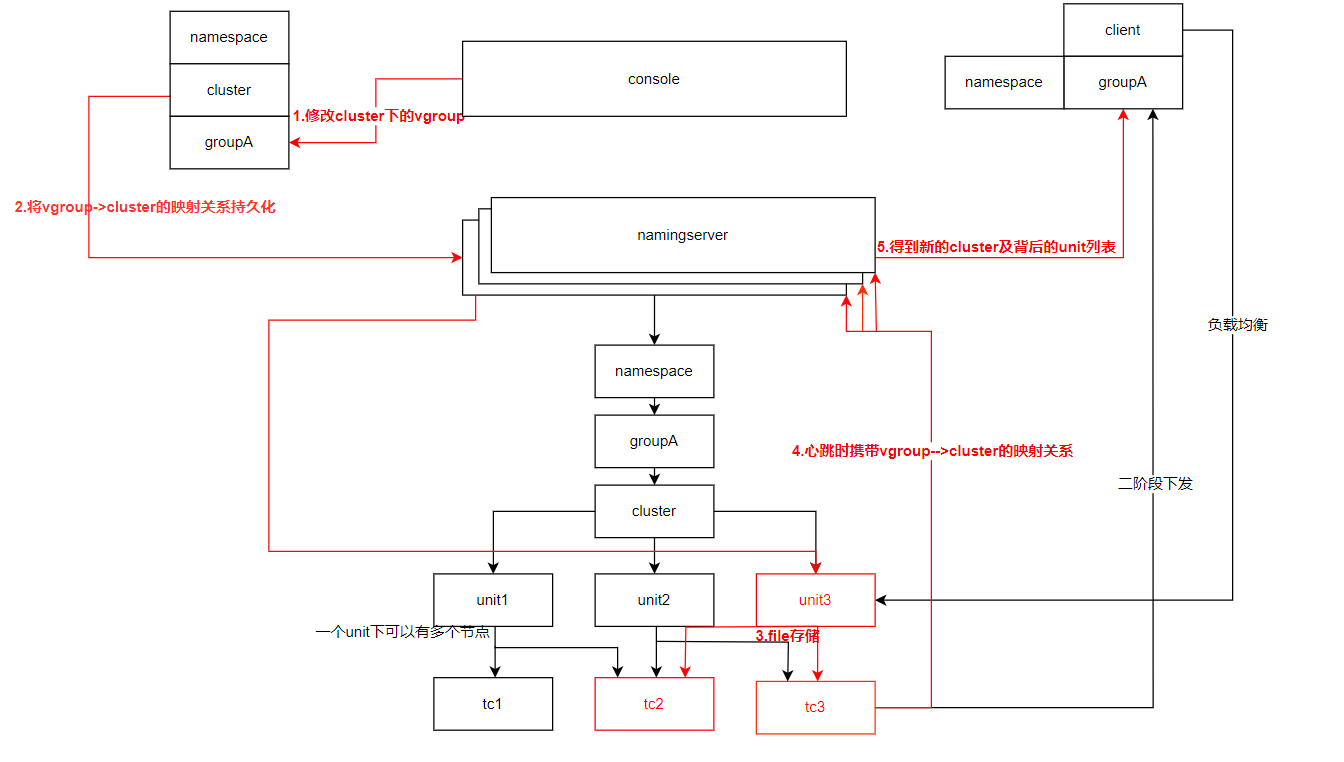 4.client通过自己的事务分组从namingserver刷新到新的cluster元数据,用新的clutser下的unit负载均衡