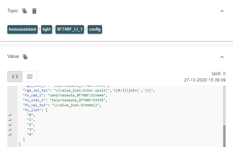 {"name":"Tasmota","stat_t":"tele/tasmota_9F74BF/STATE","avty_t":"tele/tasmota_9F74BF/LWT","pl_avail":"Online","pl_not_avail":"Offline","cmd_t":"cmnd/tasmota_9F74BF/POWER","val_tpl":"{{value_json.POWER}}","pl_off":"OFF","pl_on":"ON","uniq_id":"9F74BF_LI_1","dev":{"ids":["9F74BF"]},"bri_cmd_t":"cmnd/tasmota_9F74BF/Dimmer","bri_stat_t":"tele/tasmota_9F74BF/STATE","bri_scl":100,"on_cmd_type":"brightness","bri_val_tpl":"{{value_json.Dimmer}}","rgb_cmd_t":"cmnd/tasmota_9F74BF/Color2","rgb_stat_t":"tele/tasmota_9F74BF/STATE","rgb_val_tpl":"{{value_json.Color.split(',')[0:3]|join(',')}}","fx_cmd_t":"cmnd/tasmota_9F74BF/Scheme","fx_stat_t":"tele/tasmota_9F74BF/STATE","fx_val_tpl":"{{value_json.Scheme}}","fx_list":["0","1","2","3","4"]}SCREENSHOTS
