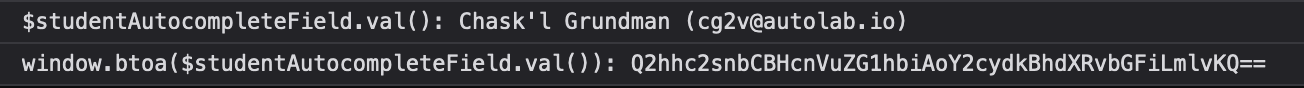 Then When the javascript calls btoa on Chask'l Grundman ([email protected]), it gets Q2hhc2smYXBvcztsIEdydW5kbWFuIChjZzJ2QGF1dG9sYWIuaW8p which does not match. However, the existing code is broken if there are tags in the name (materialize strips the tags - there's no xss). So perhaps the correct thing to do is to escapeHTML before encoding. Things are getting very hacky at this point and it leads me to wonder how other software deals with this problem. |