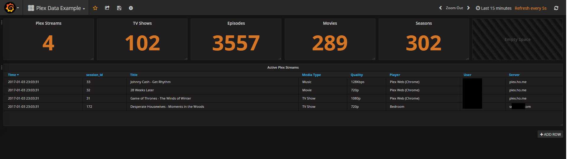 This is a tool for collecting some basic info about your Plex server and sending it to InfluxDB. This is ideal for displaying Plex specific information in a tool such as Grafana.