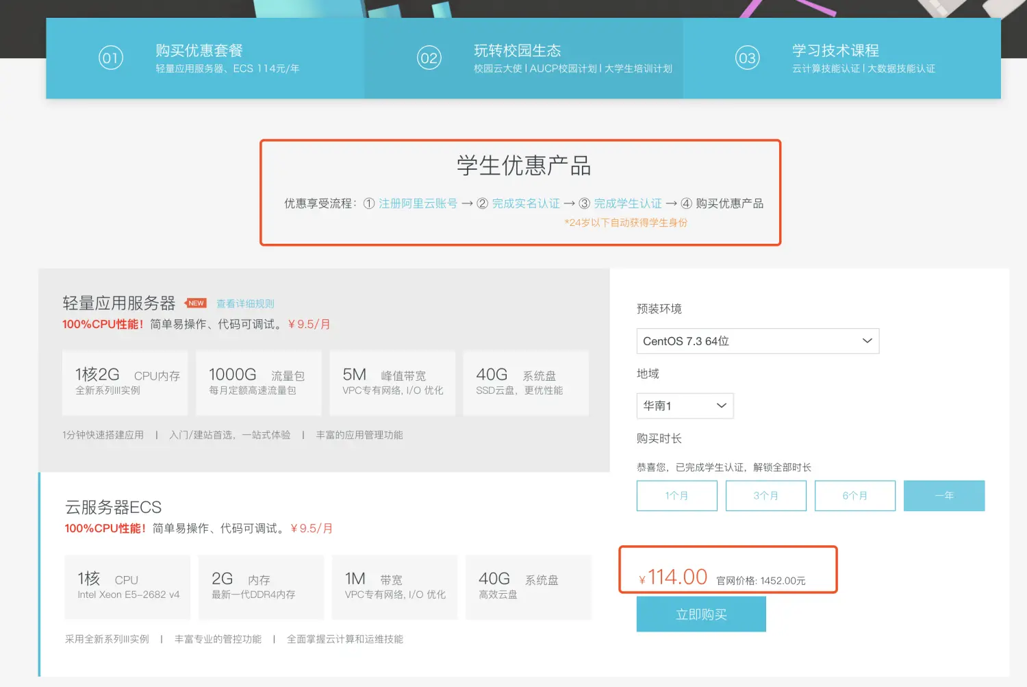 阿里云有个专供学生的云翼计划 阿里云学生套餐,入门级的云服务器原价1400多,学生认证后只要114一年,非常划算。