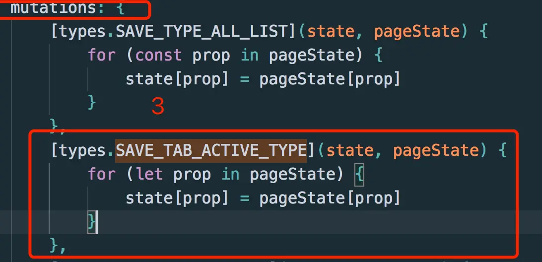 4. 调用保存值,这里的 SAVE_TAB_ACTIVE_TYPE 要与定义在第2中 type 里面的对应,而且 对象里的 key 要与initPageState里面定义的对应,如 tabActiveType。