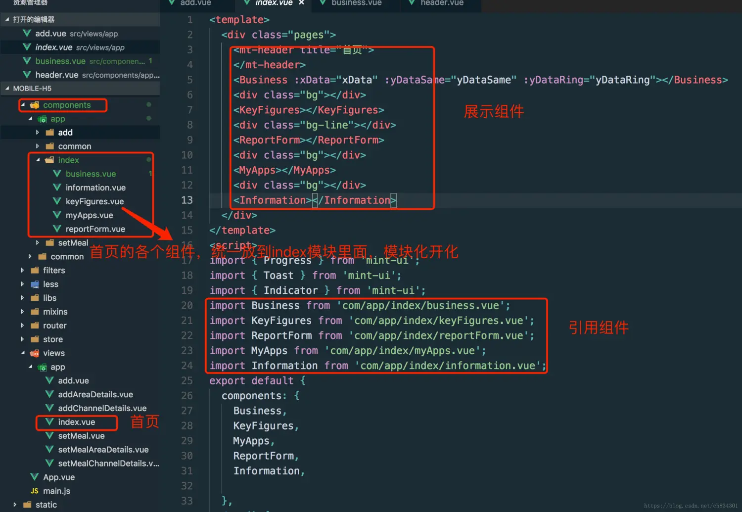 项目举例:比如一个h5的首页,可以分为标题组件,业务实时组件,关键指标组件,tab切换组件。这几个组件的几乎没有联系,可以相互独立。