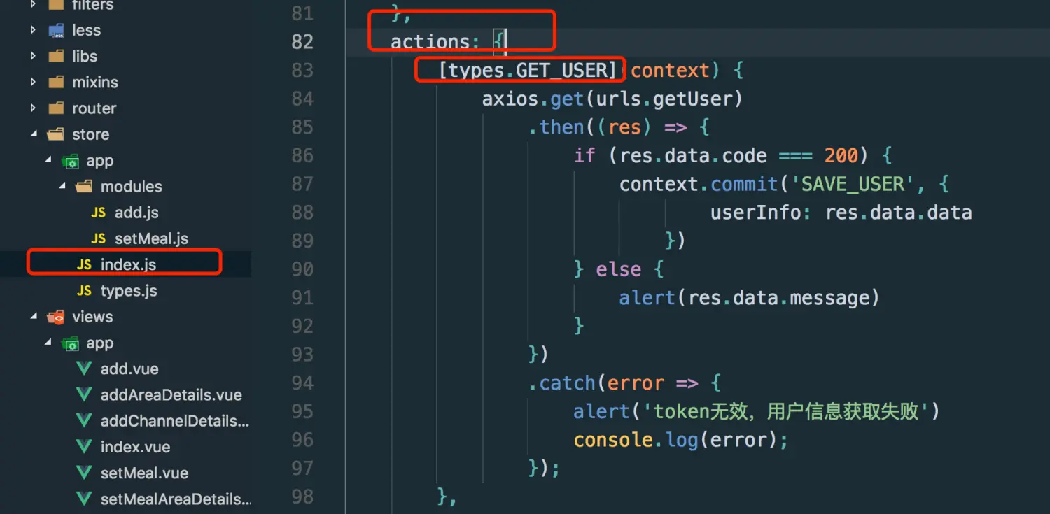 2. 在相应模块的 actions 里定义一个方法,如下图:
