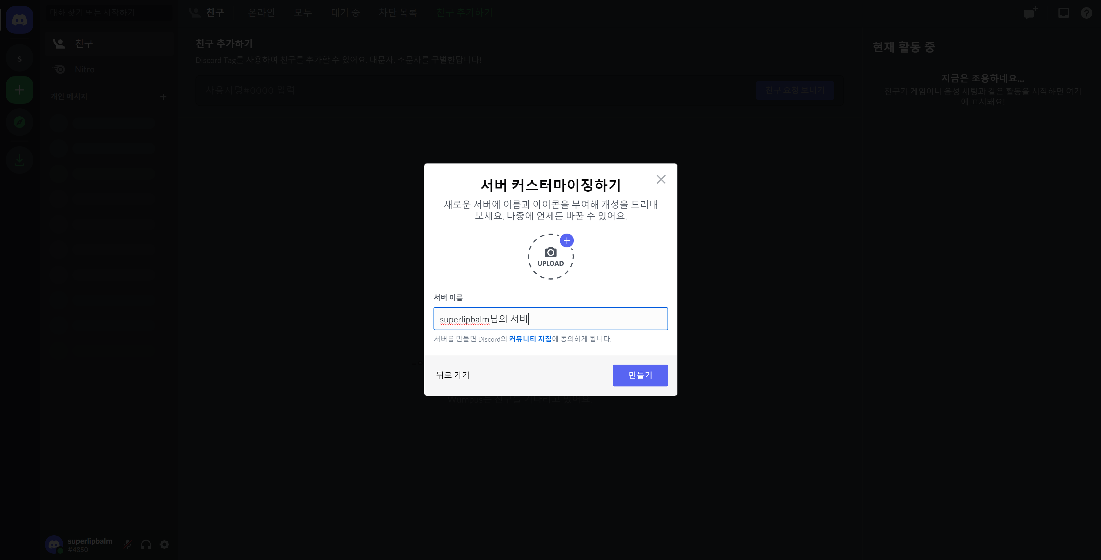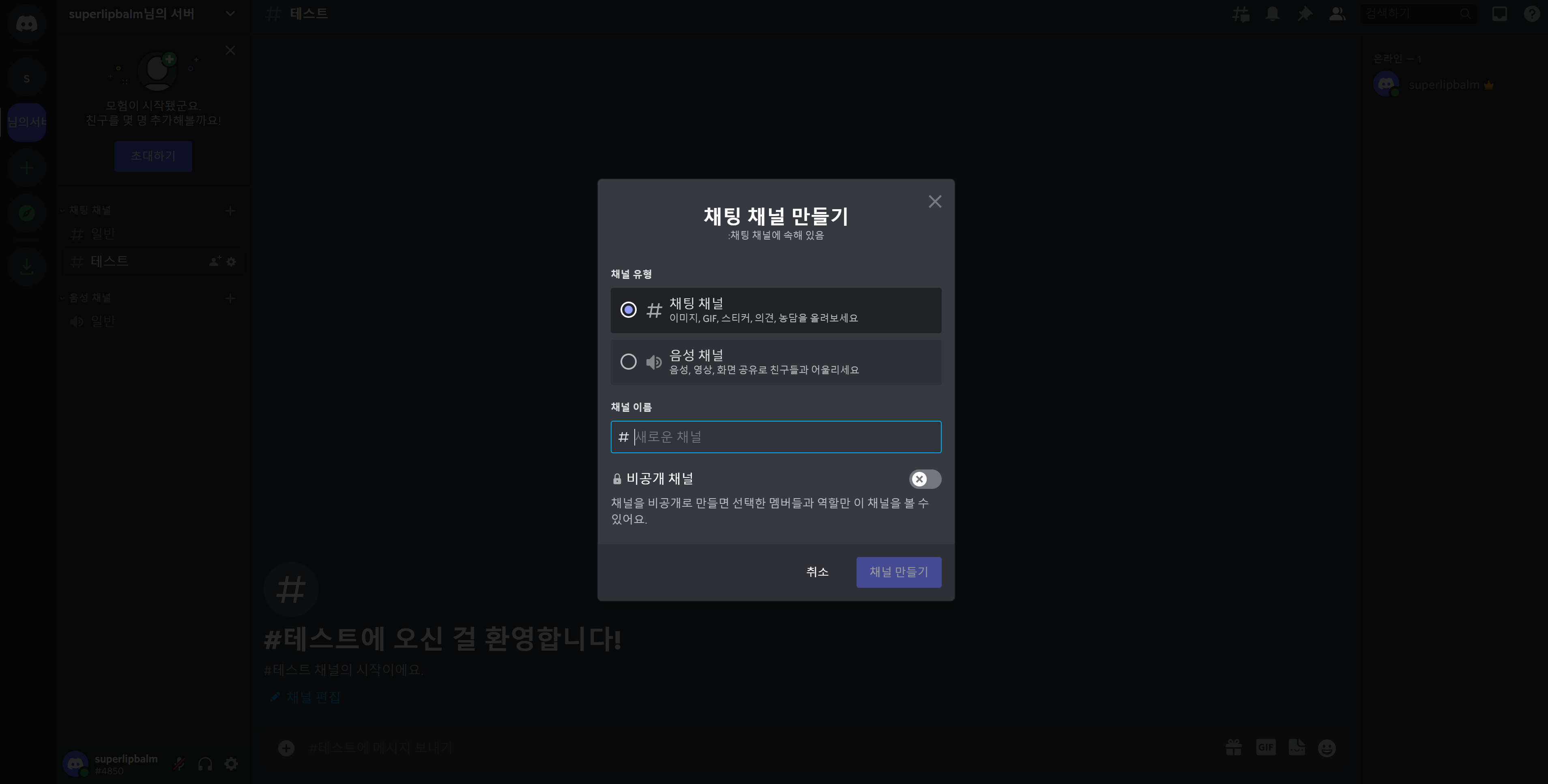 - 채널 유형을 선택하고 이름을 입력한 후 만들기 버튼을 눌러 채널을 생성한다