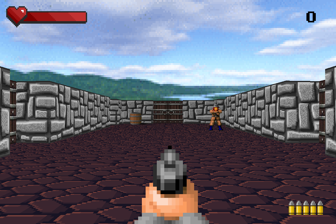 First-person 3D representation of a maze using raycasting, similar to Wolfenstein 3D (1992).