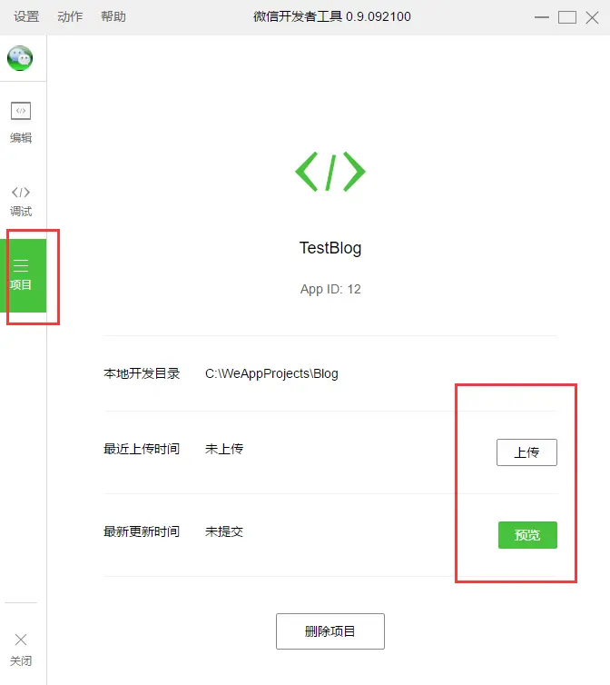 点击项目标签会出现下图,但是因为非内测人员是没有appID的,所以此处的上传和预览按钮都无效,点击会出现"invalid appid"提示,因为此处会与微信后台进行交互和验证身份
