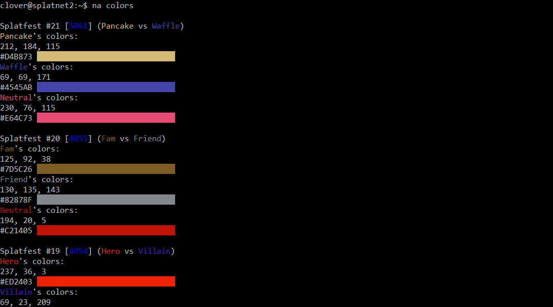 These commands will get images and JSONs relating to your profile or recent battles. After picking an option, you will likely be prompted with additional options, like the map and ink color for the profile image, or the battle number for a battle's result image.