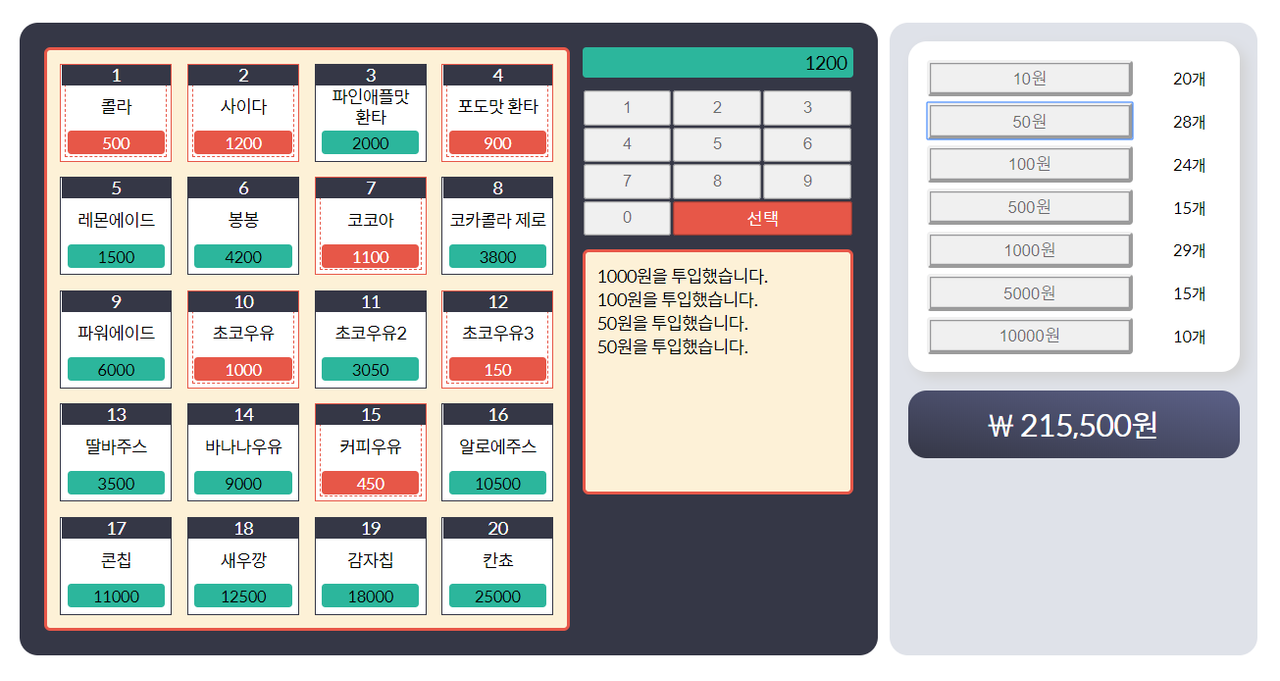 버튼을 눌러 상품을 구매합니다.상품번호는 왼쪽 상단부터 1, 2, 3 ... 순서대로 부여되어 있습니다. (콜라: 1번, 칸쵸: 20번)