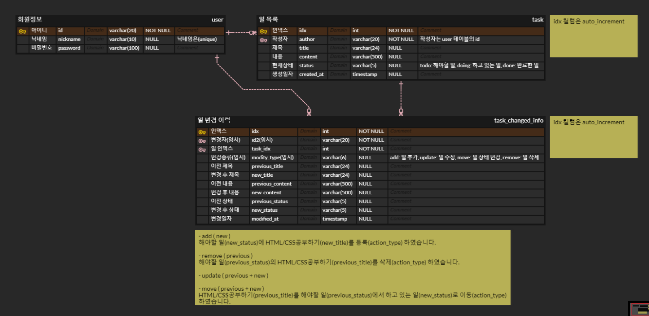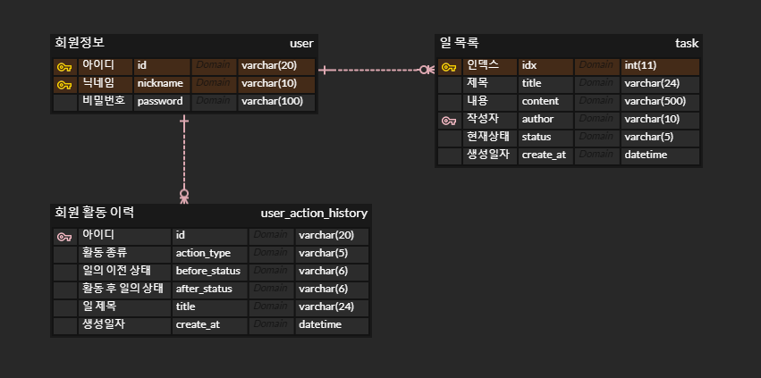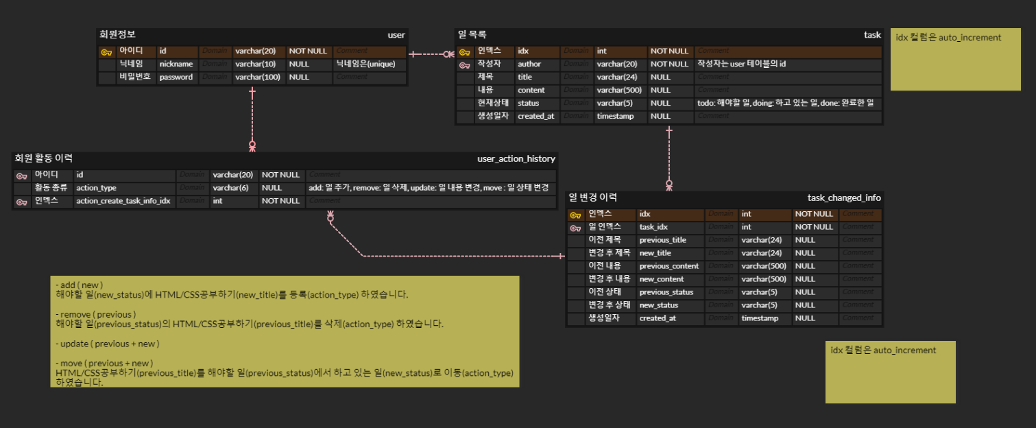 리뷰 해주신 내용으로, 테이블 구조에 대해 고민을 해봤습니다. 위와 같은 형태로 분리를 시도해 보았다가, 이게 괜찮은 구조인가? 에 대해 Lee와 함께 고민해 보았습니다. task의 데이터가 변경되는 것은 사용자가 행한 action에 의해 데이터가 1:1 매칭으로 생성이 되는데, 회원 활동 이력이라는 범주가 필요한 것인가에 대한 의문이 들었습니다. 실제로 로깅에 필요한 핵심이 되는 데이터는 task의 변경 로그 데이터인데 너무 사용자의 로그를 기록해야 한다는 것에 초점이 맞춰져 있었다는 생각이 들었습니다. 그래서 관점을 바꿔 위와 같이 task의 변경 이력을 남기는 테이블을 만들고, 변경자와 변경의 종류를 넣어서, 사용자의 활동 이력을 조회할 때 사용자를 쿼리 조건으로 걸어 해당 사용자가 task를 변경 시킨 이력을 반환하는 형식으로 가는 것이 어떨까는 결론이 나와 방향을 바꿔 보았습니다. |