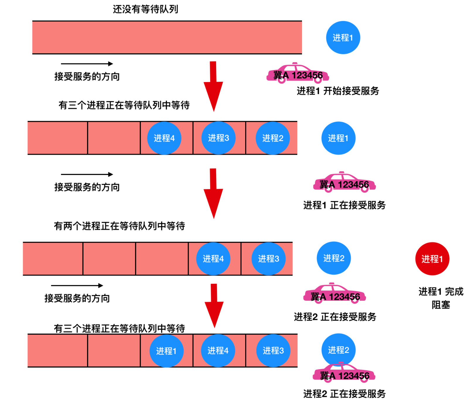 很像是先到先得。。。可能最简单的非抢占式调度算法的设计就是 先来先服务(first-come,first-serverd)。使用此算法,将按照请求顺序为进程分配 CPU。最基本的,会有一个就绪进程的等待队列。当第一个任务从外部进入系统时,将会立即启动并允许运行任意长的时间。它不会因为运行时间太长而中断。当其他作业进入时,它们排到就绪队列尾部。当正在运行的进程阻塞,处于等待队列的第一个进程就开始运行。当一个阻塞的进程重新处于就绪态时,它会像一个新到达的任务,会排在队列的末尾,即排在所有进程最后。