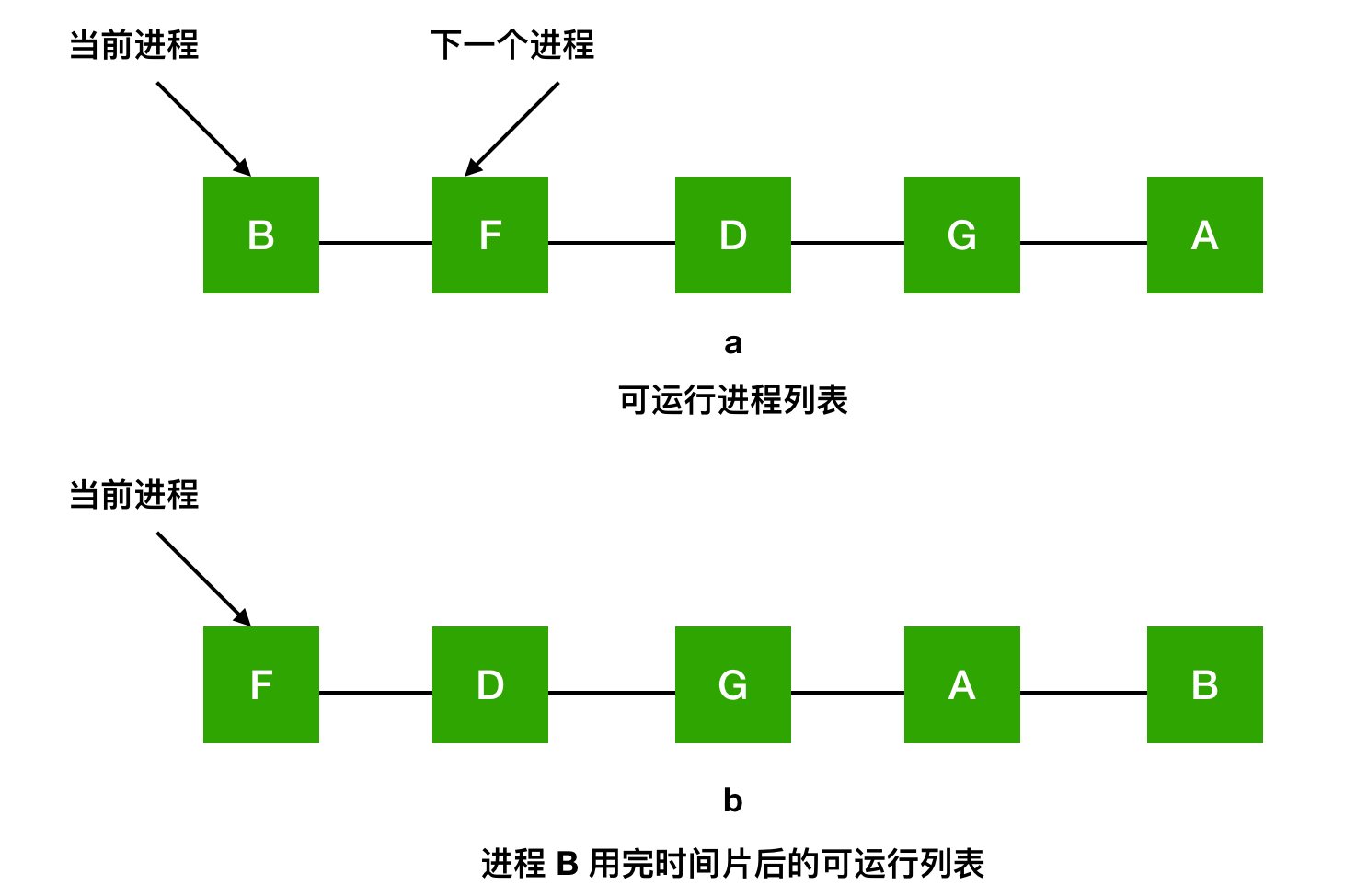 一种最古老、最简单、最公平并且最广泛使用的算法就是 轮询算法(round-robin)。每个进程都会被分配一个时间段,称为时间片(quantum),在这个时间片内允许进程运行。如果时间片结束时进程还在运行的话,则抢占一个 CPU 并将其分配给另一个进程。如果进程在时间片结束前阻塞或结束,则 CPU 立即进行切换。轮询算法比较容易实现。调度程序所做的就是维护一个可运行进程的列表,就像下图中的 a,当一个进程用完时间片后就被移到队列的末尾,就像下图的 b。