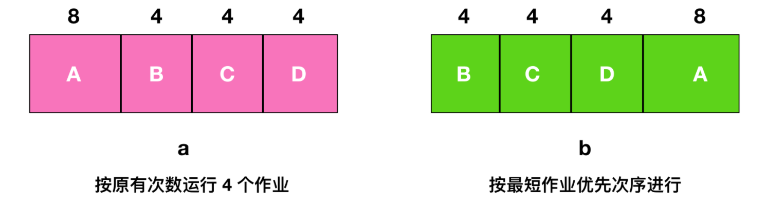 如上图 a 所示,这里有 4 个作业 A、B、C、D ,运行时间分别为 8、4、4、4 分钟。若按图中的次序运行,则 A 的周转时间为 8 分钟,B 为 12 分钟,C 为 16 分钟,D 为 20 分钟,平均时间内为 14 分钟。