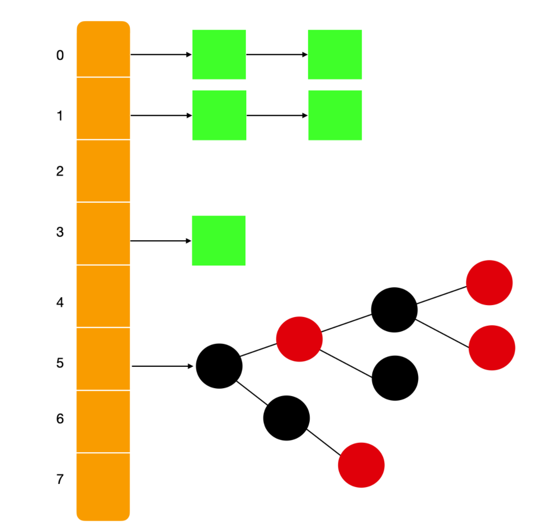 所以,与 JDK 1.7 相比,JDK 1.8 在底层结构方面做了一些改变,当每个桶中元素大于 8 的时候,会转变为红黑树,目的就是优化查询效率。