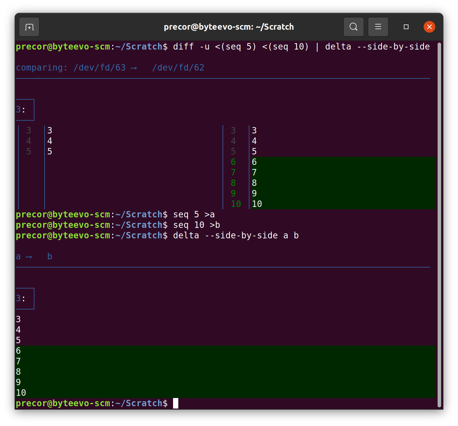precor@byteevo-scm:~/Scratch$ delta --side-by-side a b