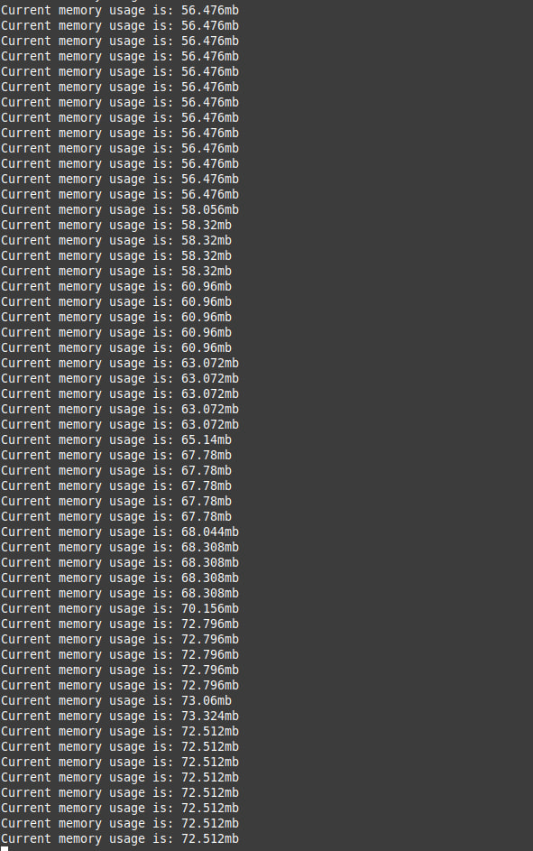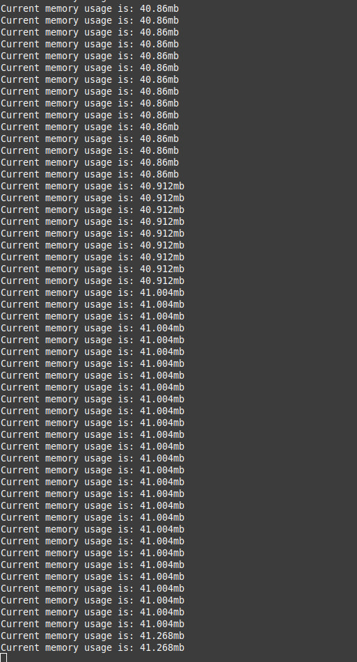 At the beginning of the test, RAM usage is at ~= 30 MB. At the end of the test after like 10 minutes, it is 75 MB.