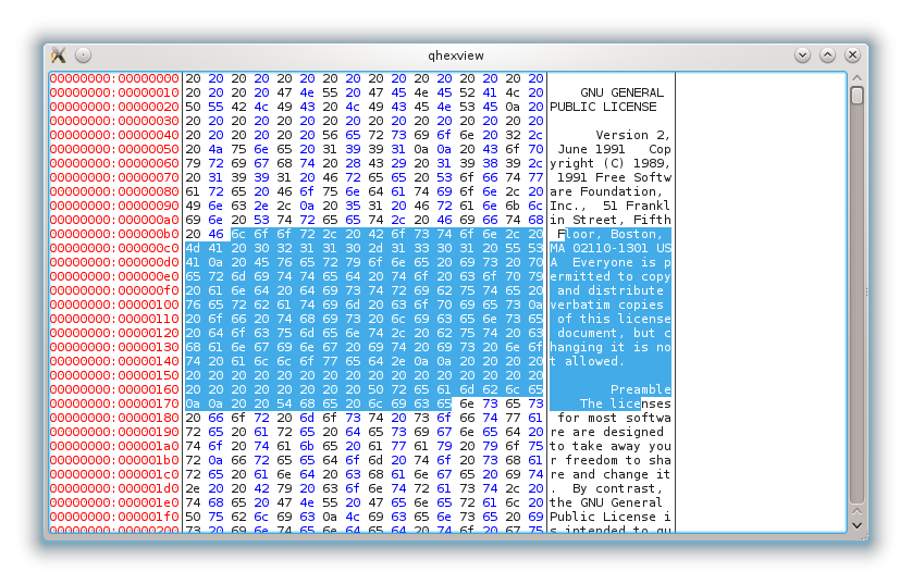 A Qt widget designed to give a nice looking but traditional hex view.