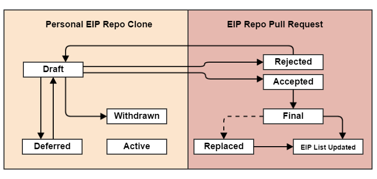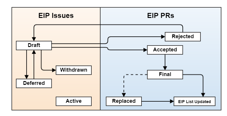 - As people discuss the idea in the PR, the draft is updated until it is successfully formalized and the status is switched from "Draft" to either "Accepted" or "Rejected" depending on consensus (which is judged by the editors and in the future Ethereum based signaling methods/contracts).