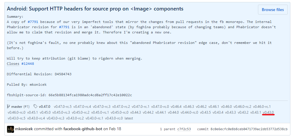 @gayancliyanage looking at this PR's history, this PR was closed in favor of PR #12448 by mkonicek. Looking at that PR, it was merged as commit 8c0e6ec. And looking at that commit, we can see the first stable release of React Native to include that commit is 0.43: |
