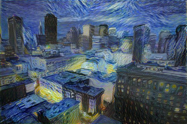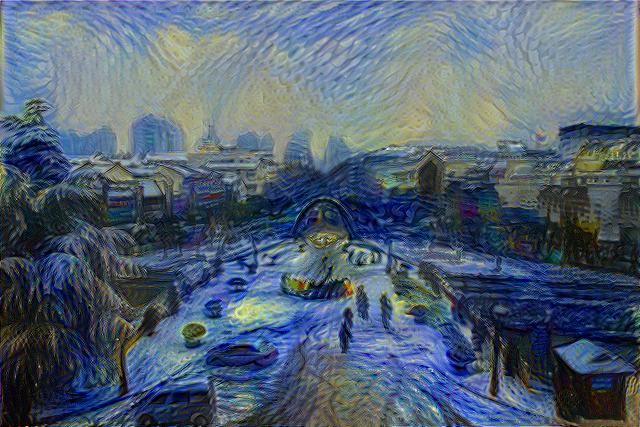 Original images: San Francisco by Anh Dinh, Nanjing in winter snow, 2008 by Emma Gawen, and Blade Runner's Johannesburg by Andrew Moore. All images were released under the Creative Comments license. Each output image was initialized with the content image, and 500 BFGS iterations under the VGG model were performed in each instance.