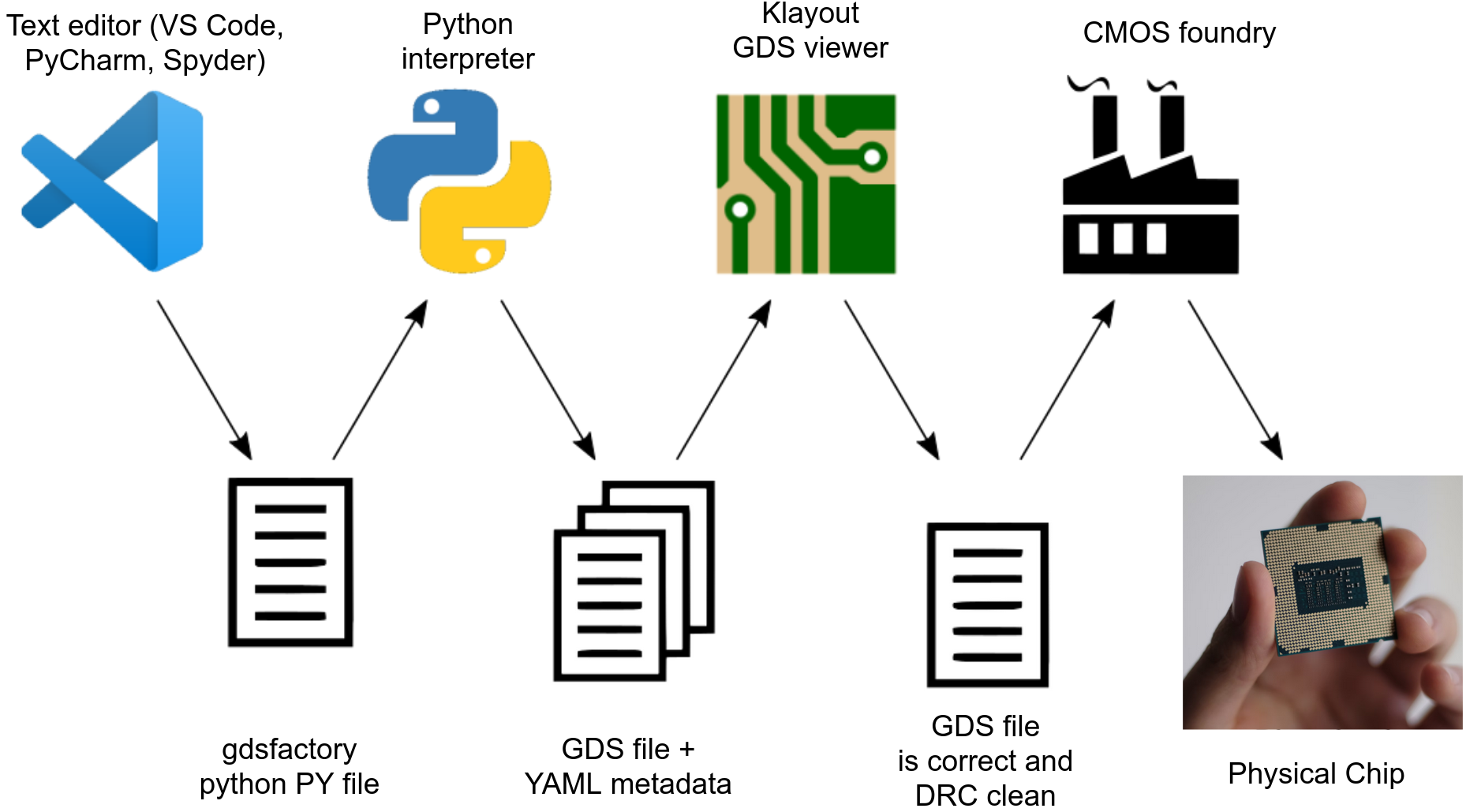 Gdsfactory is a Python library for designing chips (Photonics, Analog, Quantum, MEMs, and more), 3D printed objects, and PCBs. Here, you can code your hardware design in Python or YAML, perform verification (DRC, simulation, and extraction), and enable automated testing in the lab to ensure your fabricated chip meets your specifications.