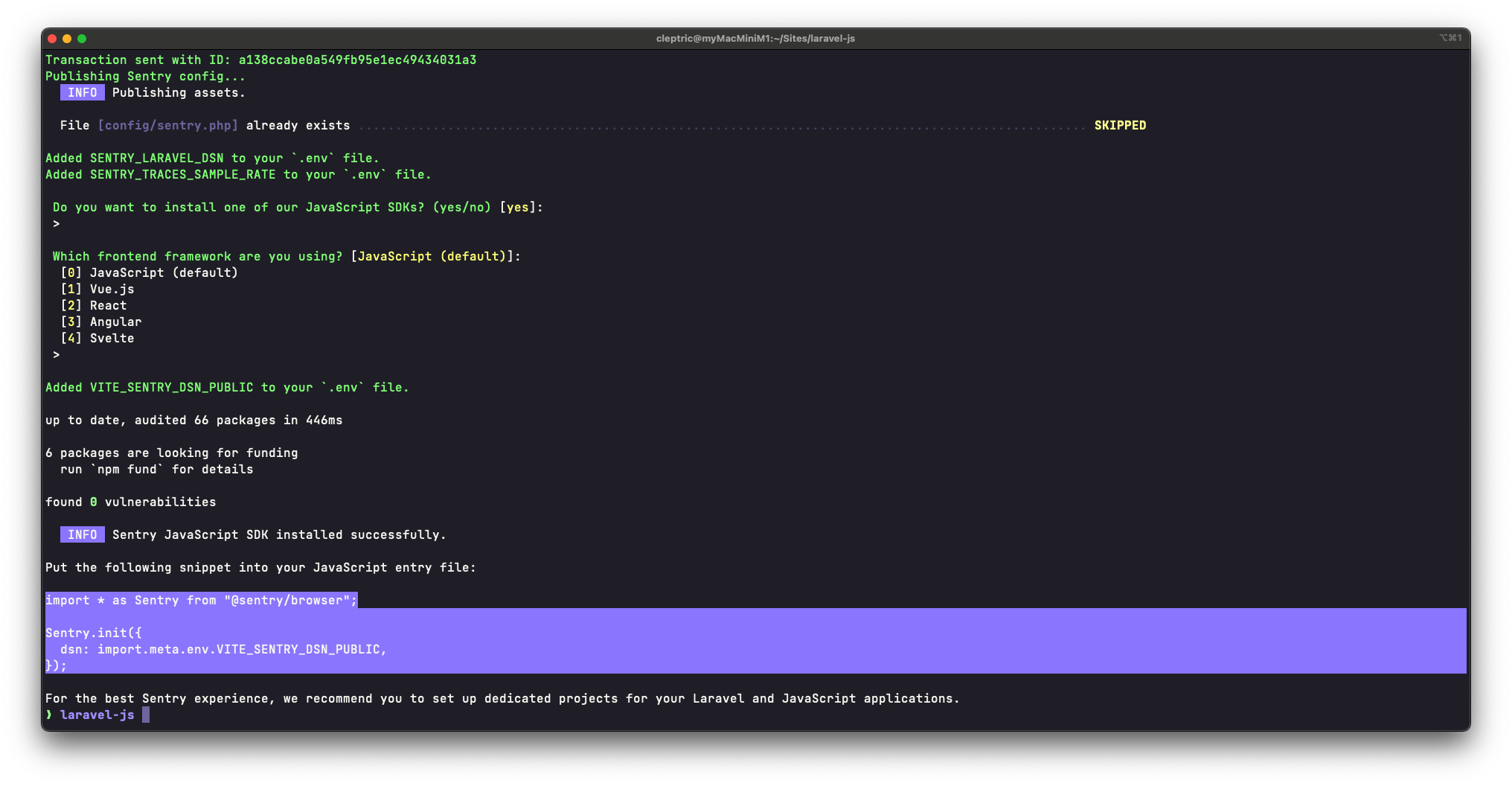 https://vitejs.dev/guide/env-and-mode.html#env-files Let's target Laravel 10/9 with Vite, as 8 and below use Webpack. I don't see many people creating new projects with these older versions. I'll also add another "Vanilla.js" choice to install our default browser integration. Additionally, we can also expand the snippets, as all Laravel version ship with Axios by default, so we can also add performance monitoring. Brb! |