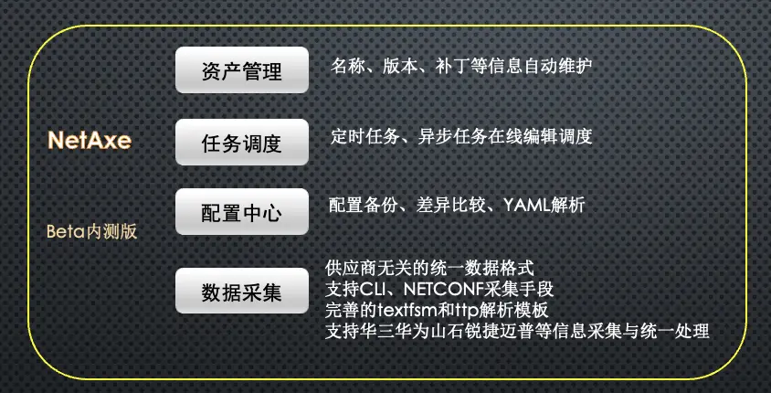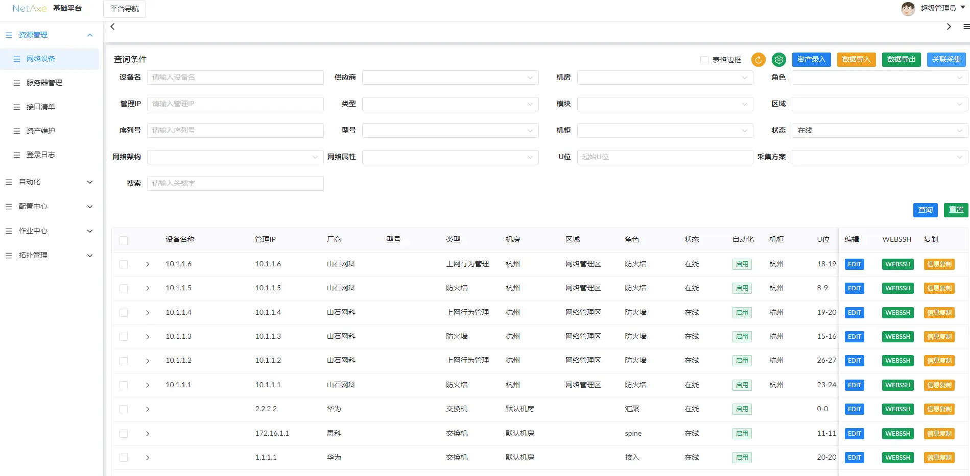 [ NetAxe ]是一个网络自动化领域解决方案框架,通过微服务和微前端的方式构建的应用集合,主要有资源管理、配置管理、自动化、网络拓扑、地址定位、地址管理等等功能集合,同时各个微应用支持插件形式的能力集成,方便用户自行扩展。
